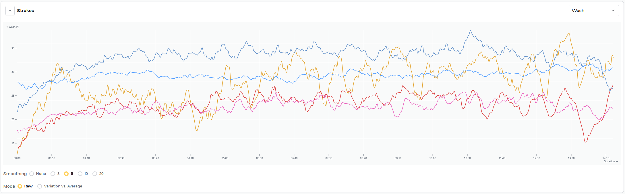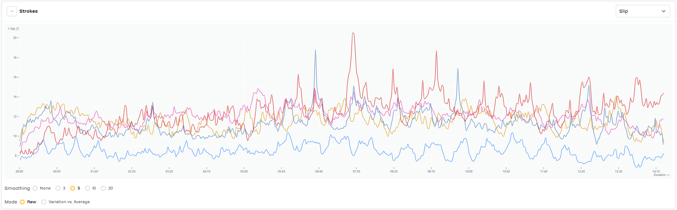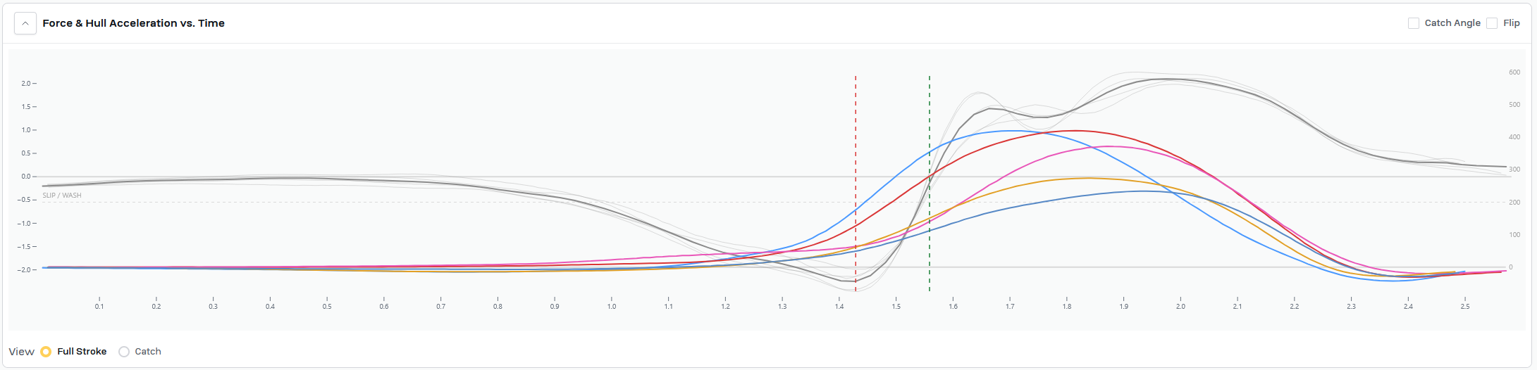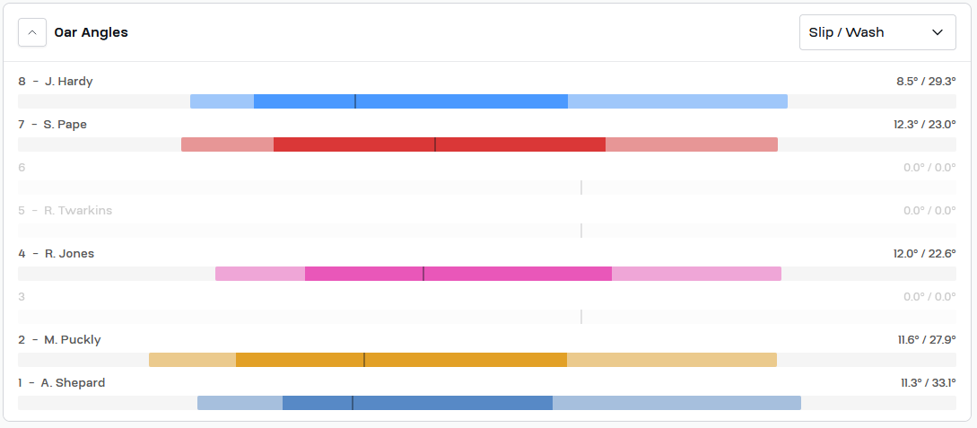 Here is the data captured from the race. Unfortunately we only had five operational oarlocks. Included Power/Time, Slip/Time, Wash/Time, Force Curves, Handle Speed/Angle & Angle barcharts.
