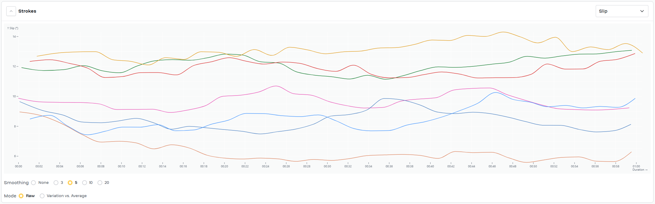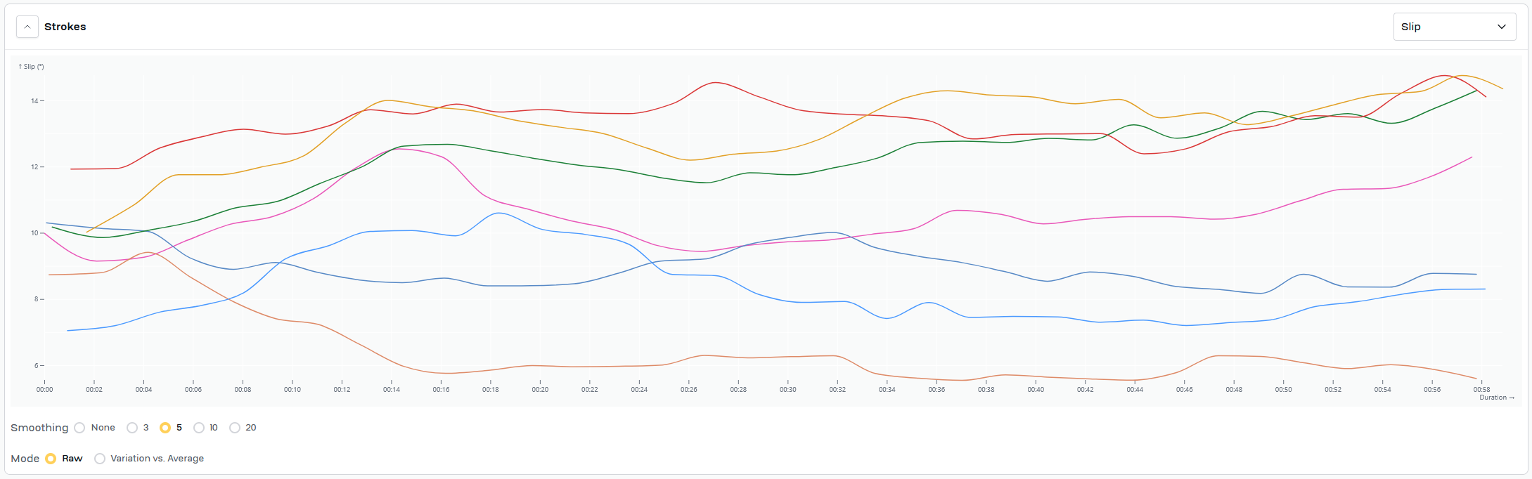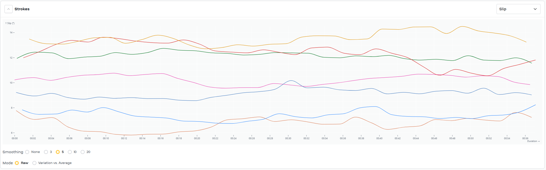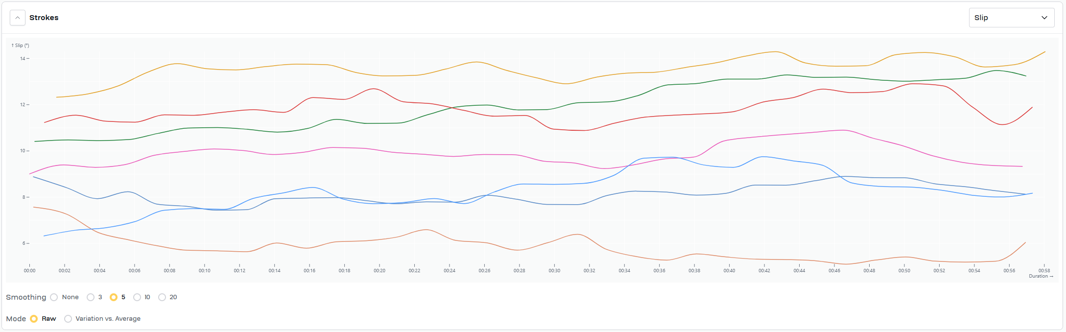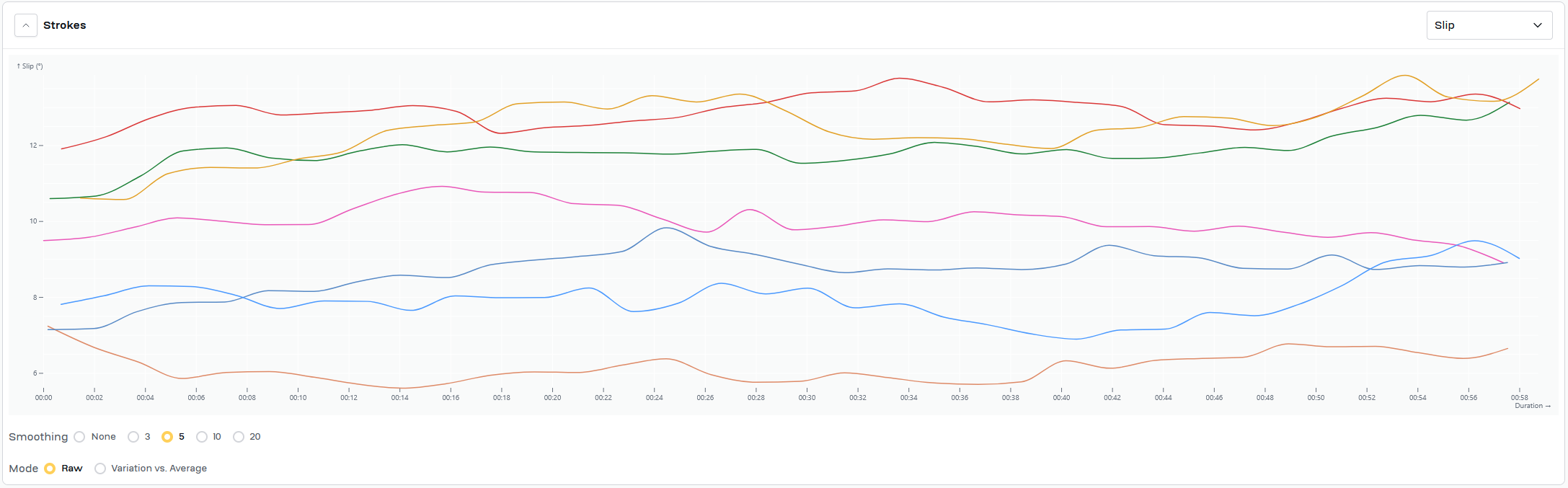 Work for today was same as Wednesday, 7x2'@24/1'@34. Swapped power/time chart for both slip/time and wash/time for each piece. Added a timestamp to the video to try to give context for the slip/time and wash/time graphs.